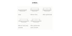 Versions : base, tête en bois, tête capitonnée, tête en bois avec console, tête capitonnée avec console.